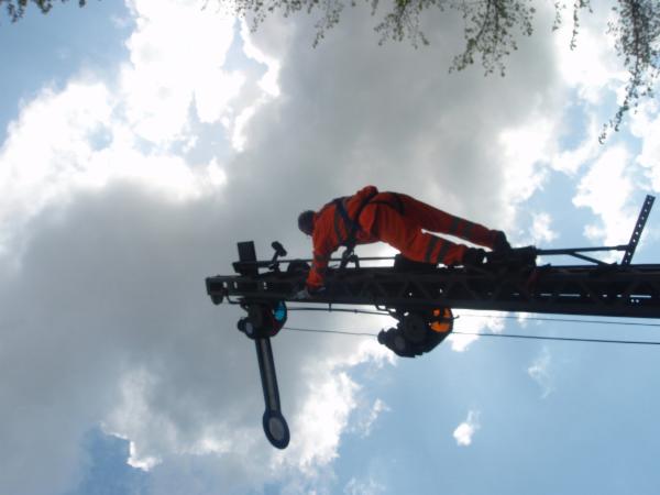 Signalwartung in großer Höhe mit Sicherheitsgeschirr.
