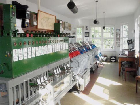 Block-und Hebelwerk im Obergeschoss des Stellwerkes.