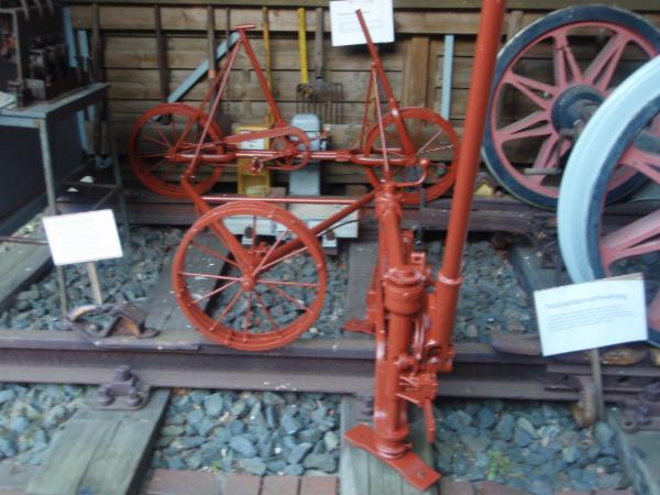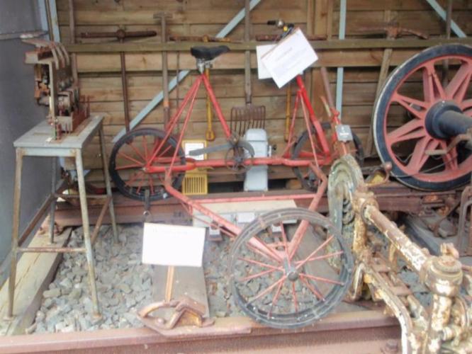 Gleisfahrrad und Schienensäge vor der Behandlung - und